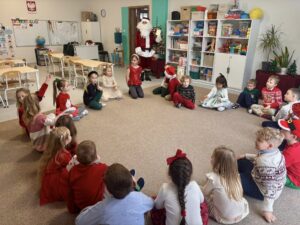 04.12.2025r. w naszym przedszkolu panowała prawdziwie magiczna atmosfera. Odwiedził nas Święty Mikołaj, który wywołał u dzieci ogromną radość i mnóstwo uśmiechów. Było wspólne śpiewanie, zabawy, świąteczne zadania oraz chwila na pamiątkowe zdjęcia.