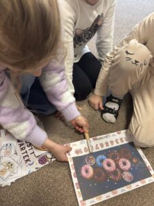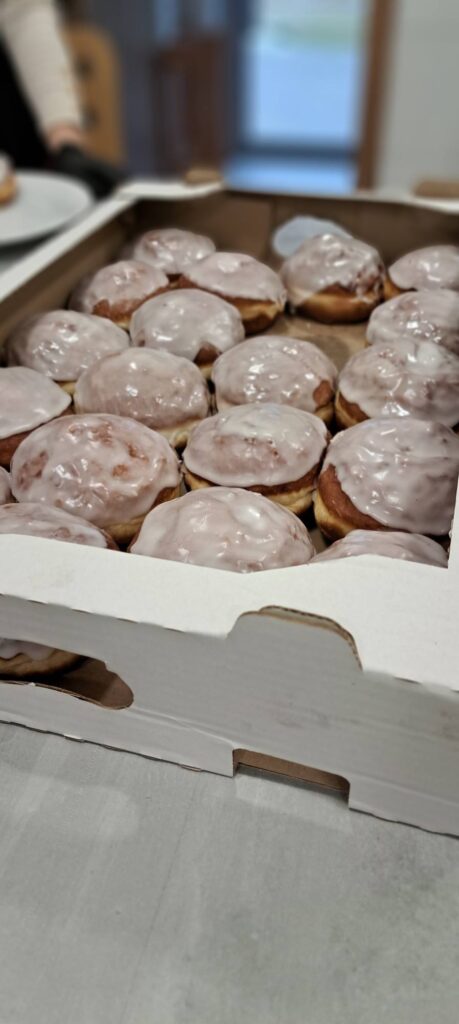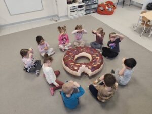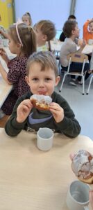 Dzisiejszy dzień upłynął nam w słodkiej i radosnej atmosferze! Rozpoczęliśmy od rozmowy o tym, czym jest Tłusty Czwartek i jakie tradycje są z nim związane. Dzieci z dużym zainteresowaniem słuchały i dzieliły się swoimi doświadczeniami